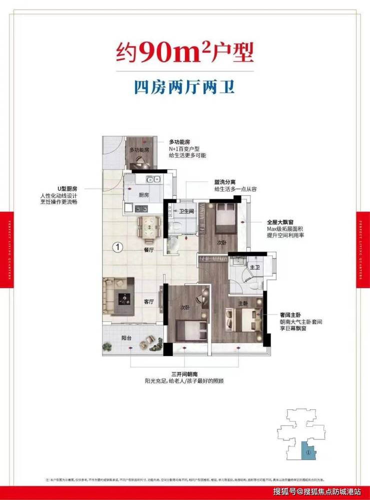 约89-90㎡全系带主套四房,三开间朝南,阳光充足;奢阔主卧带卫浴间,守护居者私密空间;N+1百变户型足以满足三代同堂的居住需求。
