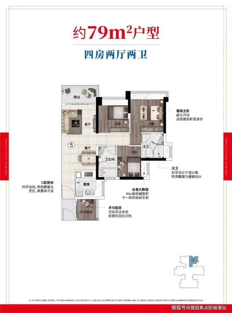 约79㎡全系带主套四房产品,是广州难得的极致户型,同等面积产品多一房一卫,全屋大飘窗提升空间的使用率,观景阳台为家中带来更好的采光和通风,U型厨房科学动线设计,烹饪轻松,活动空间更开阔。