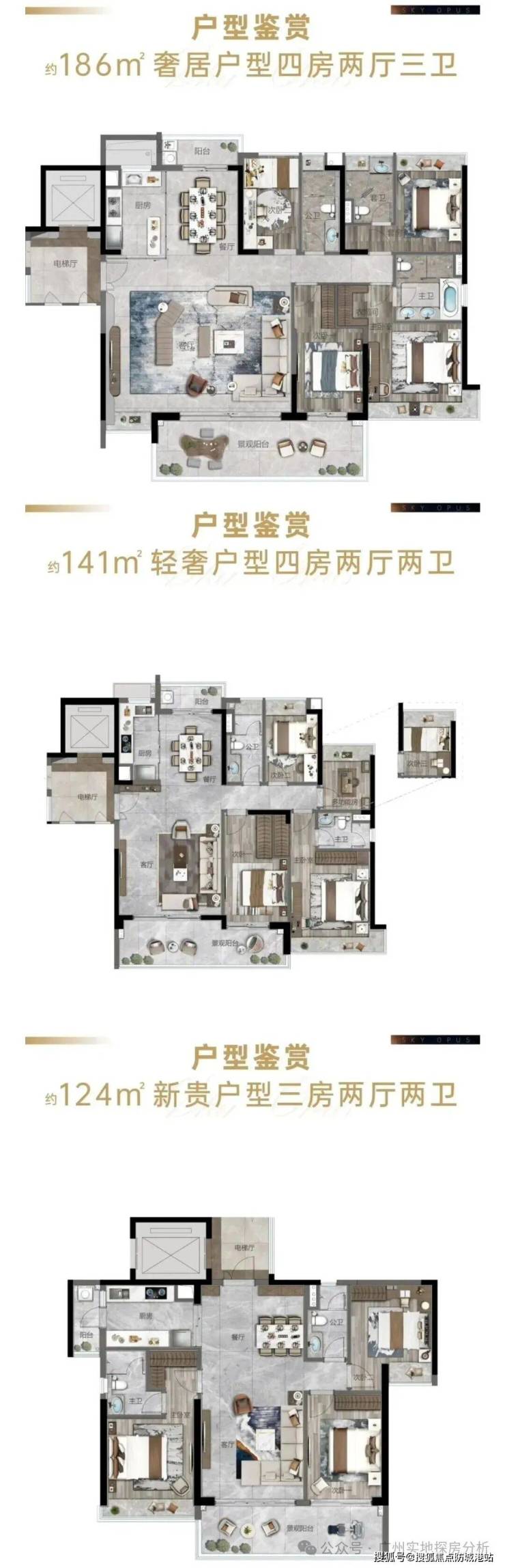 户型“才艺展示”:主打124平、141平、186平的全南向大平层!采用板式建筑,南北对流,就像给家装上了会呼吸的肺。开创式的大面宽、大开间、双阳台设计,再加上2梯3户的低密梯户比和私家电梯入户,把仪式感和舒适度直接拉满。