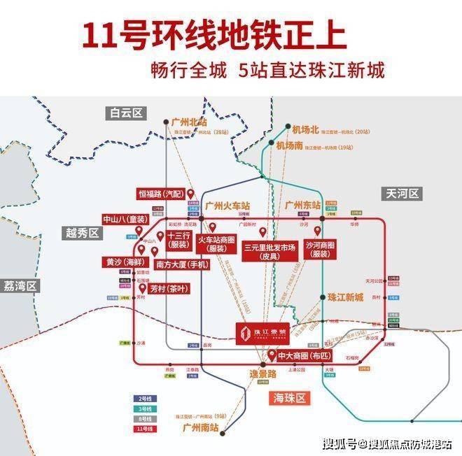 项目最大优势在于地铁11号线逸景路站正上盖,负一层直通站厅(11号线已于2022年底通车)。作为广州首条环线,11号线串联天河、越秀、荔湾、白云、海珠五大核心区