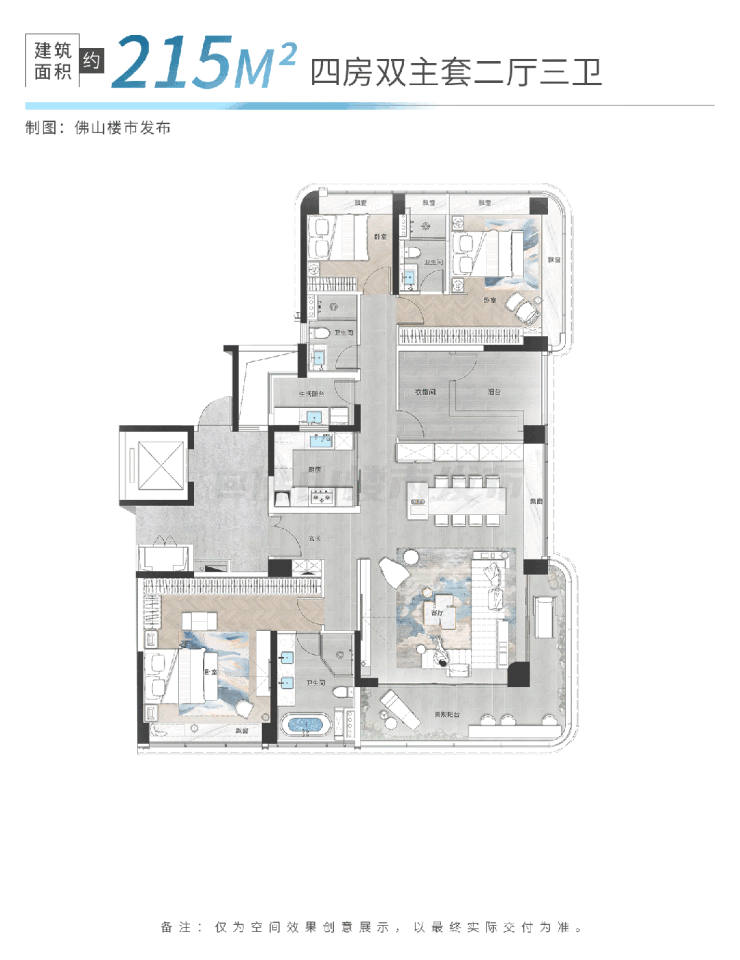 户型设计上,项目展现了超强的产品力。以建面约 215㎡户型为例,采用端厅设计,配备双主卧套房,空间尺度感十足;270° 环幕弧形转角阳台,不仅拓展了室内采光面,更能直面中央园林美景,将湖居与园景双重景观融入日常生活。所有户型均注重空间利用率与舒适度,布局合理、动静分区明确,满足高端家庭的居住需求,无论是三口之家还是三代同堂,都能享受惬意生活。