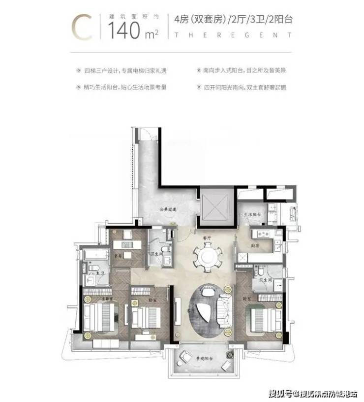 约140㎡ C户型:注重南向园景的优美视野,适合小家庭或二人世界。宽敞明亮的客厅和卧室设计,为您带来温馨舒适的生活体验。