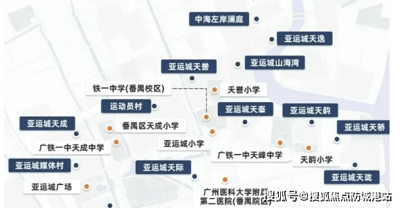 教育配套堪称王牌:亚运城整体规划 19 所学校,18 所已开学,涵盖幼儿园至高中,包括广铁一中等省一级学校,项目业主子女可就近享受全龄优质教育,无需担忧升学问题。商业配套规模庞大:周边已开业 6 万㎡亚运城广场、3 万㎡喜街、4 万㎡碧乐时光广场;未来中海商管将扩建 10 万㎡中海环宇城(广州第二座),另有新华里商业 mall、天悦商业广场等,日常购物、餐饮、娱乐一站式解决。医疗方面,项目内有三甲广医二院番禺院区,规划广州中医药大学附属中西医结合医院,社区卫生服务站(天誉已启用)与 3000㎡卫生服务中心(天珑在建),健康保障全覆盖。社区还配套体育公园、10km 环城健康绿道,西侧体育馆含壁球、台球等设施,满足全龄运动需求。