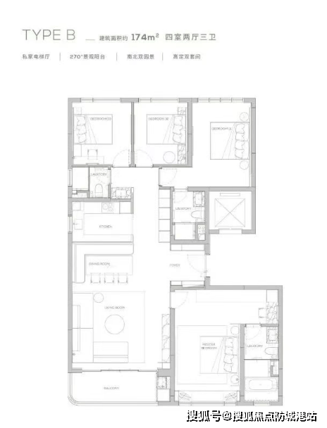 174㎡户型:不仅有独享的私家电梯厅,还配备了270度环幕观景阳台与高定双套间,可尽情欣赏周边美景,提升居住品质。