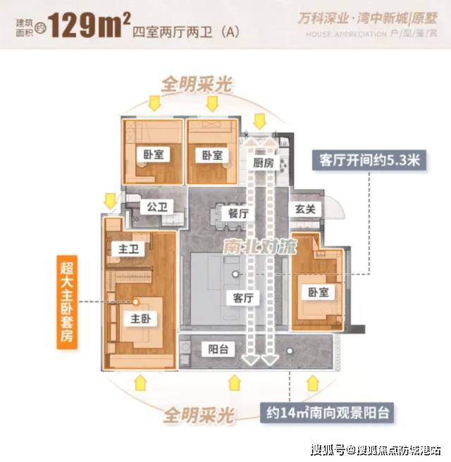 两个户型各有春秋,139㎡有着南北对流双阳台,开间约5.6米的大客厅,270°环幕飘窗的主卧。129㎡动区空间联通,形成了一个进深约12米,开间约5.3米的家庭活动场所。方便家庭成员沟通的同时,也充分利用了过道空间。