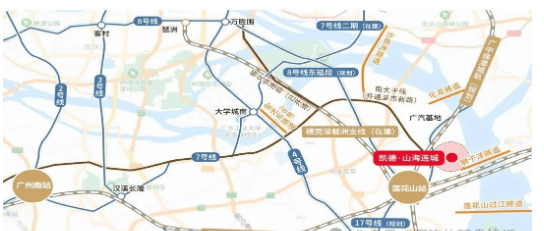 凯德山海连城坐落于广州番禺莲花湾核心区域,占据湾区交通枢纽的核心位置,凭借“三城轨两地铁”的多维交通路网,实现与广州核心CBD及周边城市的快速连通,交通优势成为项目的核心竞争力之一。