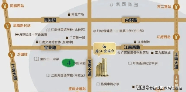 说到珠江金瑶台的配套,最亮眼的当属交通优势。项目堪称 “双地铁上盖”,距离地铁 8 号线宝岗大道站仅 280 米,步行 5 分钟就能到达,坐 1 站到昌岗站还能换乘 2 号线,去广州火车站、海珠广场都很方便;距离 2 号线江南西站也只有 800 米,步行 10 分钟左右就能到,通过地铁去往琶洲商务区、珠江新城通勤都不算远,对于上班族来说十分友好。