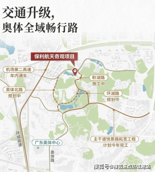 交通方面,项目距离地铁21号线大观路站约1.7公里,日常通勤主要依赖自驾或电瓶接驳。 虽然步行稍远,但开车前往金融城约8公里、珠江新城约15公里,对于在智慧城、科学城或奥体周边工作的群体来说,通勤时间基本可控在30分钟内。值得注意的是,随着十五运会临近,奥体板块正加速推进路网升级——悦景路拓宽工程即将完工,未来将直连机场第二高速;规划中的聆湖路也将打通世界大观与大观中路的连接,进一步优化区域微循环。