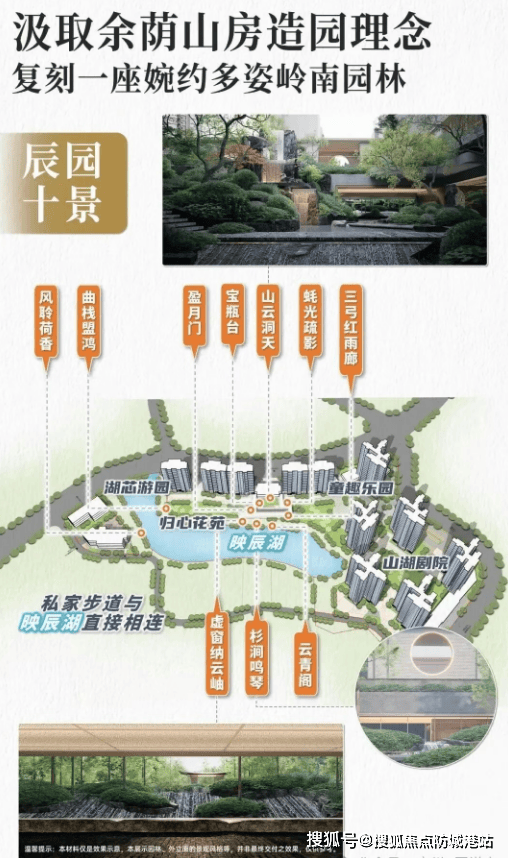 社区内部规划延续了岭南园林的造园智慧,以“水居中、环水建园”为骨架,打造“辰园十景”。 从归家大门70米宽的恢弘界面,到借鉴余荫山房“藏而不露”理念的动线设计,再到铜钱纹地砖、天然石材铺装等细节,整体营造出既有文化厚度又不失现代感的归家体验。儿童活动区、健身房、瑜伽室等功能空间也融入景观之中,避免割裂感。尤为特别的是,项目保留并升级了原有的映辰湖,湖岸线被精心梳理,搭配杉林、荷塘、叠瀑等元素,形成可游可憩的立体水景系统。