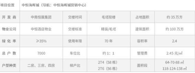 中恒海晖城由佛山市中南恒展房地产有限公司开发。项目总占地 35 万㎡,总建面 100 万㎡。目前在售 56、58 栋,交楼时间为现楼。绿地率≥35%,容积率 2.4,产品面积为 64 - 146㎡精奢户型,总户数 7000 + 户。物业为中恒酒店物业,具备国家一级物管资质,拥有 20 年丰富管理经验,物管费 2.45 元 /㎡/ 月。项目配建国际 IEC 双语幼儿园(已开学),西侧规划一所市政公办小学,一路之隔有南海信息技术学院(已开学),周边 3km 内涵盖南海高新区第一小学(公立已开学)、小塘小学 / 小塘中学(公办省一级,已开学),5km 内多所石门名校环绕。紧邻南海人民医院新院,自拥星级中恒酒店、成熟商业街区并规划打造约 20 万㎡高档大型商业综合体。内部拥有约 10 万㎡阔景园林,配套游泳池、乐活跑道、运动球场等均已投入使用。