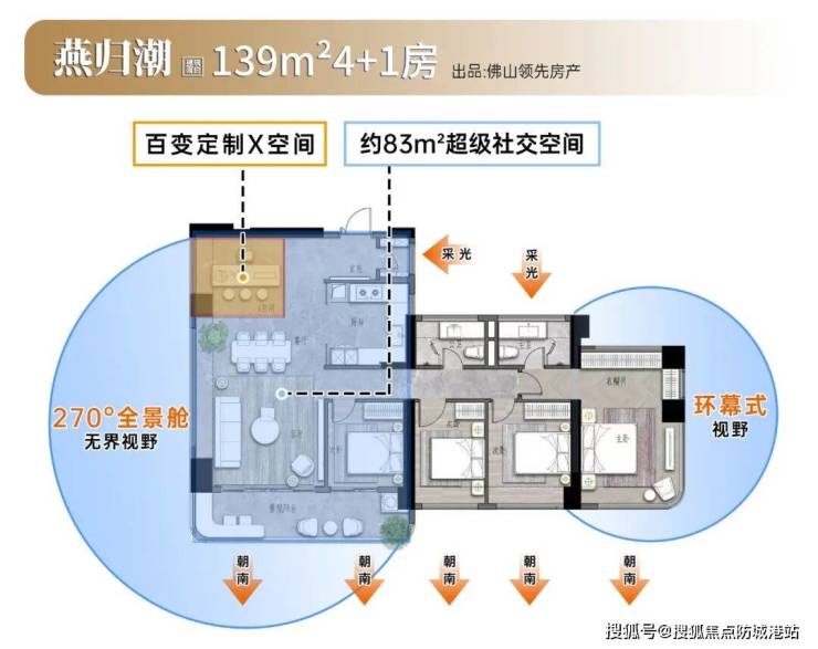招商佛山序推出的139㎡起步的全系大平层户型,以其高效的空间利用率赢得了市场的广泛关注。例如,139㎡的燕归潮户型,通过精妙的设计实现了五开间全朝南,总采光面长达45米以上,创造出一个明亮通透的生活空间。此外,户型内设有多个功能区,包括主卧套房、内外双玄关、近7.5米观景阳台等,既满足了日常生活的需要,也为家庭聚会等活动提供了充足的空间。