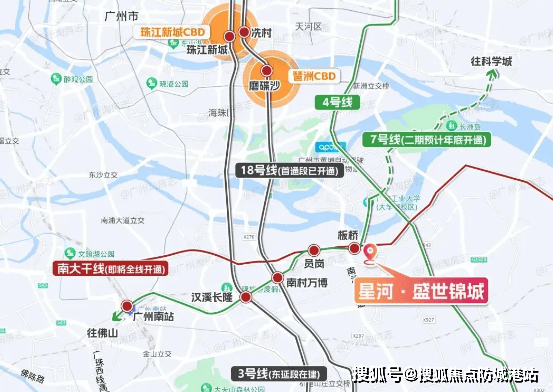 项目坐拥“双地铁+三纵三横”立体交通体系:地铁7号线南村万博站距项目约800米(步行10分钟),2站直达广州南站(全国高铁枢纽),4站抵达琶洲会展中心;地铁18号线万博站(已通车)距项目约1.2公里,1站到冼村(珠江新城CBD),30分钟覆盖天河、海珠、荔湾等核心区。自驾出行可通过南沙港快速、新光快速、华南快速三大主干道,15分钟直达珠江新城,20分钟通达琶洲、大学城,30分钟抵达白云国际机场。此外,项目周边规划有公交首末站,未来将开通社区接驳巴士,进一步缩短通勤时间。