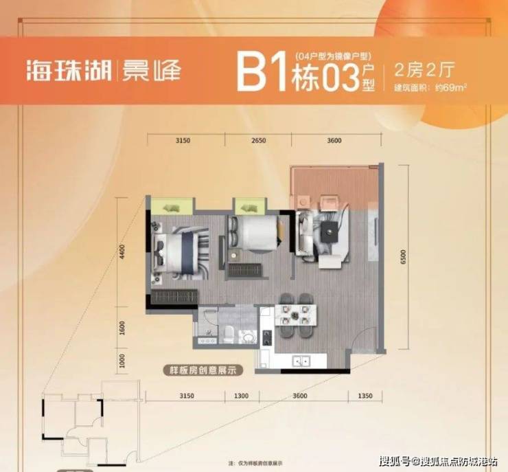 建面约68㎡2房2厅:动静分区格局,餐厨一体,空间开阔,适合年轻家庭或单身人士。