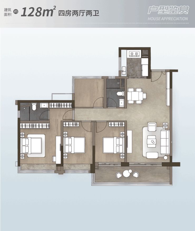 A 区 128㎡的 4 房两卫户型位于 2 梯 3/4 户,南向竖厅 4 房设计。该户型总价大概在 270 - 430 万,望湖楼栋价格更高,近 500 万,好楼层可达 530 万。四房的设计能满足家庭人口较多的居住需求,无论是三代同堂还是二孩家庭,都能拥有独立的居住空间。南向竖厅设计,保证了客厅和餐厅的采光和通风,让室内空间通透开阔。各个房间布局合理,动静分区明确,休息区与活动区互不干扰。客厅连接景观阳台,不仅增加了空间感,还能欣赏到小区内外的美景。对于改善型购房者来说,该户型在满足居住需求的同时,也能提供舒适的居住体验。