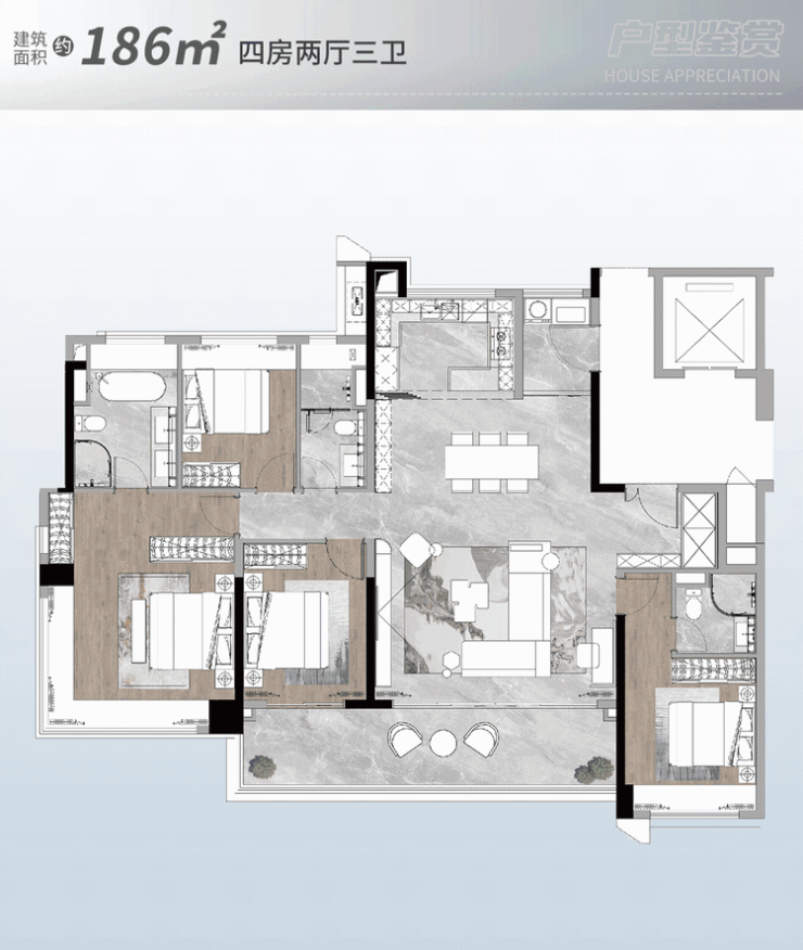 B 区 186㎡的 4 房 3 卫户型位于 37 座 2 梯 2 户,同样是南北对流专梯专户 4 房设计。价格区间在 4 - 4.5 万 /㎡,总价约 740 万起。与 171㎡户型相比,该户型在空间尺度上更为宽敞,各个房间的面积更大,居住舒适度进一步提升。南北对流的布局使得室内空气流通顺畅,采光充足。专梯专户设计,保证了业主的私密性。主卧套房空间更为阔绰,独立卫生间可进行更豪华的装修配置。客厅与餐厅的空间感更强,能够容纳更多的家庭成员活动。此户型适合对居住品质有极高要求,追求宽敞舒适居住空间的高端改善型购房者。