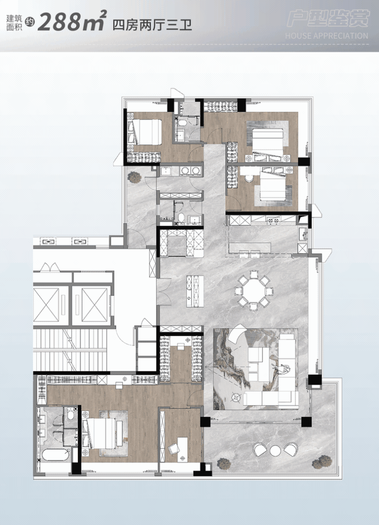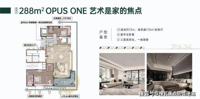 B 区 288㎡的 4 房 3 卫户型位于 36 座 2 梯 2 户,南北对流专梯专户 4 房设计。价格区间在 4.5 - 5.5 万 /㎡,总价约 1300 万起。L 型转角客厅开间一面约 8 米,另一面约 13.1 米,实现真正的 270° 环幕式采光,坐在客厅沙发上,每一面都是明亮的风景。主卧对标顶奢酒店的总统套房打造三进式格局,极具仪式感,整个南向开窗面约 10 米,不论是梳妆、沐浴、休憩,整片湖面皆可尽收眼底。该户型将尺度、私密度和恢弘景致完美融合,为住惯了豪宅的塔尖人物提供了心动神驰的终极大宅。空间布局合理,功能齐全,客厅、餐厅、卧室等区域都展现出极致的奢华与舒适,是高端品质生活的象征。