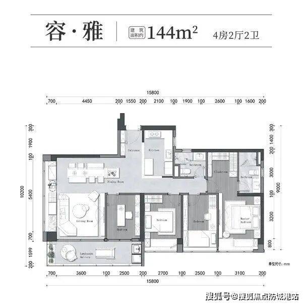 建面约144平的4房户型为南向,四个卧室都是朝南,客厅还做了一个约5.2米的飘窗,采光通风都不错,而且靠近客厅的那个书房用不着还可以打掉,扩大客厅的空间。