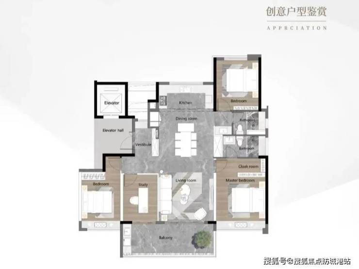 为了更好观赏园林景观,这个户型的阳台延伸到了其中一个卧室,不过由于与阳台相连,卧室的私密性会差一点。