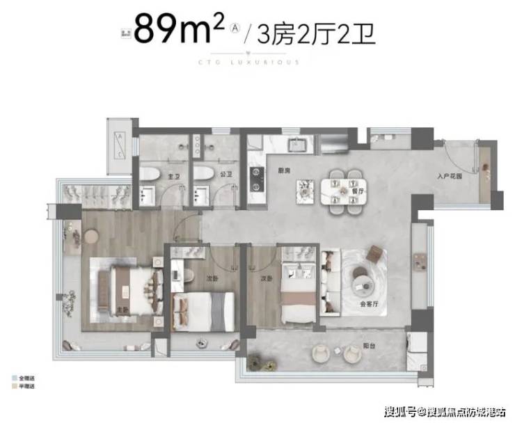户型设计:建面约89㎡三房实现“主卧套房+南北通透”,得房率超85%;143㎡四房配置双主卧套房、7米观景阳台,满足三代同堂需求。