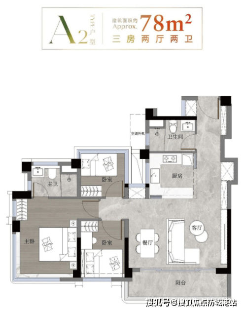 针对年轻刚需群体,中建未来方洲推出了78㎡三房两厅两卫的王牌户型。在如此紧凑的面积段内做到三房两卫,本身就是对设计能力的极大考验。而该项目不仅做到了,还做到了全南向布局,这在同面积段产品中极为罕见。