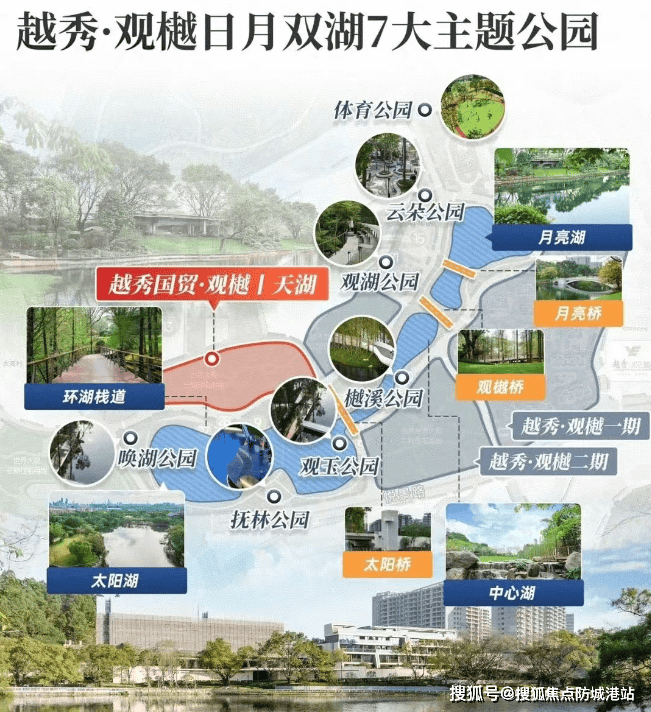 越秀观樾项目面对占地约5.3万㎡的月亮湖和太阳湖,湖岸线长达约1.9公里。项目投入巨资对月亮湖进行整治与升级改造,湖泊水质已达二类饮用水标准。围绕双湖,项目打造了七大主题公园,其中六个已经实景呈现。此外,广州首个临湖商业体也将落户于此,对标新加坡圣淘沙滨湖商业体,旨在提升居民的生活品质。