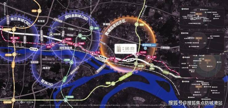 华润置地·黄埔润府位于老黄埔中心,北临原黄埔区政府,步行600米可到保利中央公馆、黄埔体育馆;东侧紧邻万科城市之光,正对面即是老牌商业体惠润广场。项目距离广州超级换乘枢纽——地铁5号线&7号线大沙东站仅约300-400米,双地铁快速通达珠江新城、金融城、科学城及南沙万博等重要城市节点。