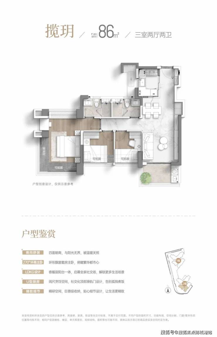 户型上与86方大差不差,每个区域空间感更强,阳台也更大,在北边也多了个暗房次卧。