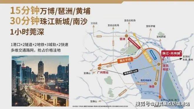 通过1港口+2地铁+3隧道+3城轨+8路网的立体交通体系,珠江未来城实现了与周边主要经济区的快速连接。例如,通过新化快速,仅需10分钟即可到达广州大学城,15分钟可抵达琶洲;通过南大干线,15分钟内可达番禺万博CBD商圈。