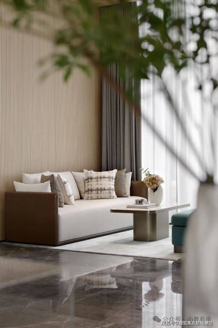 项目洽谈区空间设计以自然意境为核心,软装以浅色系家具为基础,搭配棉麻布艺、优质皮料与金属材质,在浅白色的空间主基调上,搭配多层次的咖色软装,同时在局部家私与饰品中融入绿色元素,为整个空间注入自然生机,打造兼具舒适度与氛围感的交流空间。洽谈区充分利用自然采光,午后光线透过窗纱进入室内,光影与色调随时间自然变化,与墙面实物装置画的质地有机融合,形成层次丰富的空间画面,提升空间的氛围感与舒适度。深度洽谈区采用弧形半包围沙发设计,形成半开放的私密交流空间,既保障谈话过程中的私密性,也为交流双方提供轻松舒适的沟通环境,满足不同场景的交流需求。VIP 室采用独立封闭的空间设计,打造专属的私密交流空间,为业主提供一对一的专属服务,保障服务的私密性与专属感。