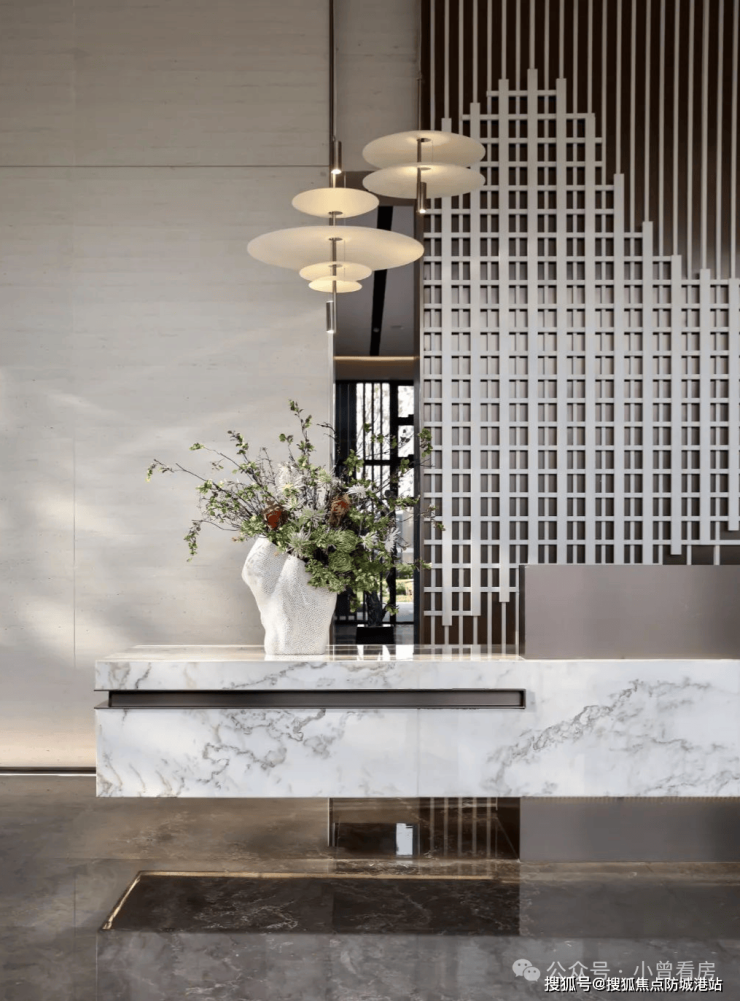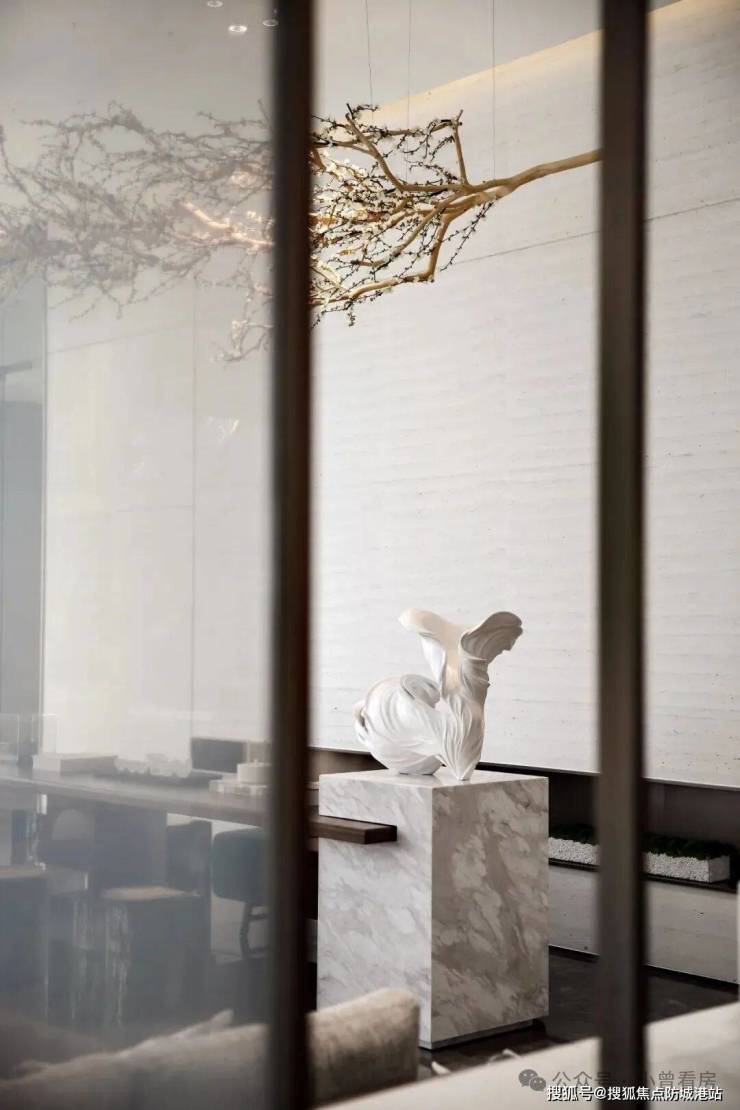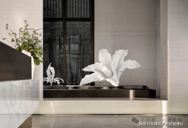 项目社区公共空间遵循 “少即是多” 的设计理念,以简洁纯粹的设计基调,打造兼具功能性、艺术性与舒适度的公区空间体系,为业主提供高品质的公共社交与休闲空间。项目前厅以简洁纯粹为设计核心,通过吊灯与花艺的对角线摆放设计,打破硬装方正平直的空间构图,在规则的空间中打造差异化的视觉体验,提升空间的设计感与品质感。偏厅区域通过艺术化的花朵雕塑设计,将花朵绽放的瞬间以艺术形式定格,为空间注入灵动的艺术气息,打造兼具观赏性与氛围感的过渡空间。水吧区采用阵列式的陈列设计,通过视觉上的秩序感打造富有层次感的空间体验,同时在细节处融入自然元素,为访客带来沉浸式的空间体验,打造兼具实用性与氛围感的休闲社交空间。