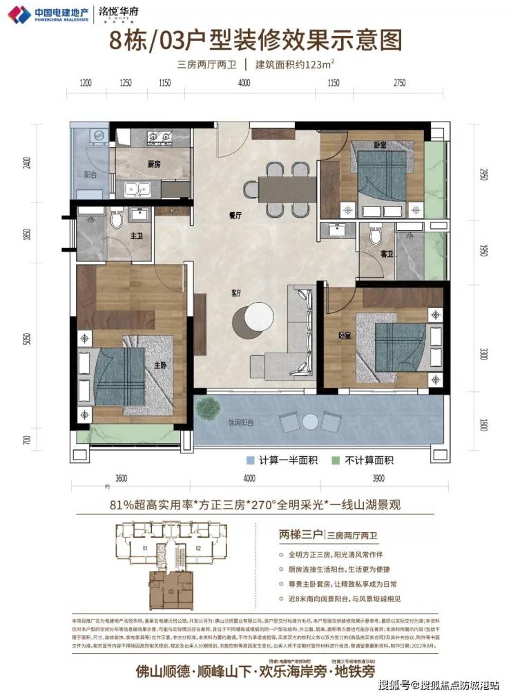 8栋03户型(建筑面积约123㎡):方正三房设计,270°全明采光,超高实用率。