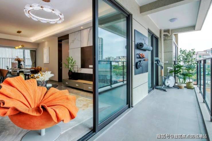 穿过客厅,便能看到一个270°的阳台,不仅可以享受大面积的园林景观,而且也给室内的采光和通风增加了不少分数。