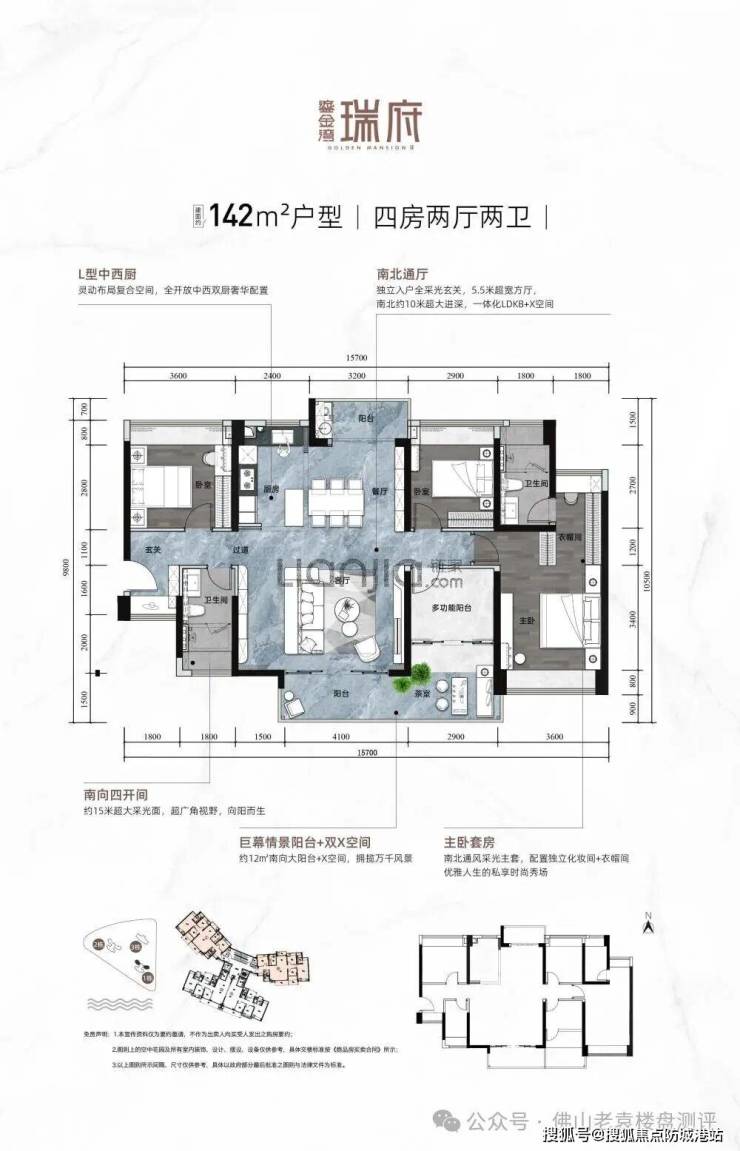 建面约142㎡的四房两厅两卫户型,是项目的主力改善产品。该户型南北双阳台对流设计,形成天然的穿堂风,夏季通风效果极佳。12米的南向巨幕面宽,五开间朝南,空间尺度感拉满。主卧配备步入式衣帽间与独立卫浴,私密性与舒适度兼具。这样的设计,非常适合二胎家庭或三代同堂的居住需求,让每一位家庭成员都能拥有独立且舒适的空间。