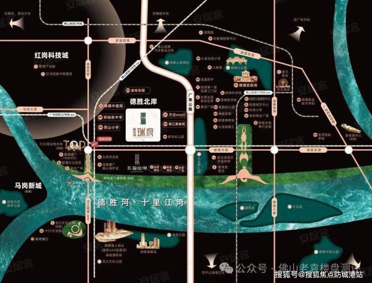 项目全称备案为“鎏金湾花园二期”,别名“涛汇鎏金湾瑞府”,其地理位置极为优越,坐落于佛山市顺德区大良街道南江社区德胜西路10号。这一选址可谓匠心独运,北依德胜河,东临德胜新城核心区,西接红岗科技城,处于城市发展的核心交汇点。项目总占地面积约1.6万平方米,总建筑面积约5.7万平方米,整体容积率控制在3.5,绿化率高达35%。虽然从数据上看,这并非一个超大型的综合体社区,但正是这种“小而美”的规划理念,使得项目能够专注于打造纯粹的居住氛围,避免了大型社区中常见的嘈杂与拥挤。