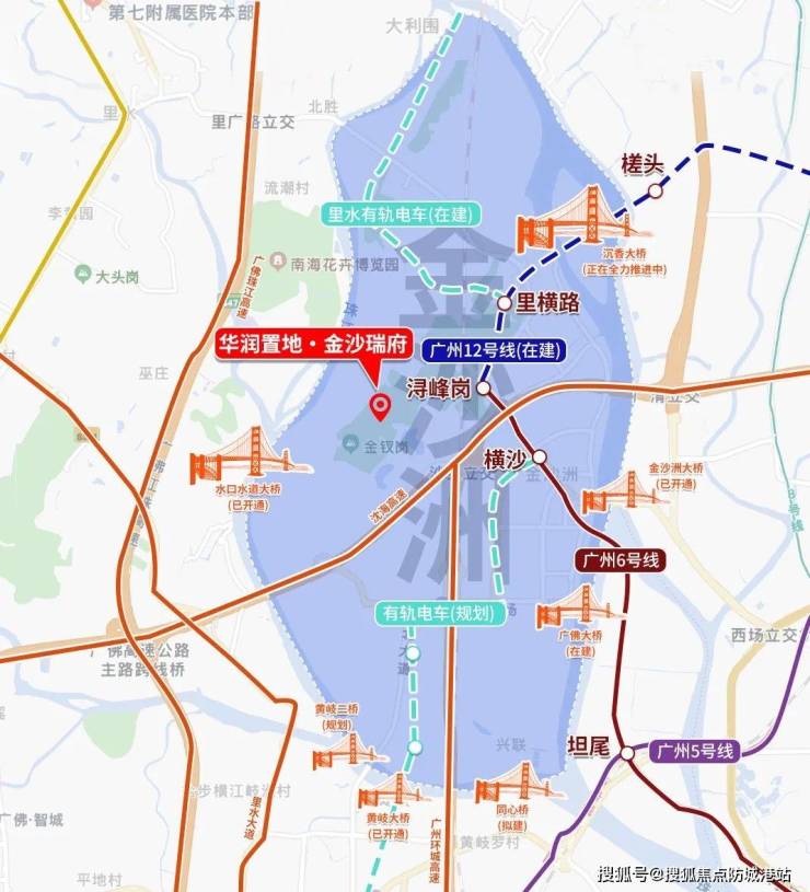 金沙瑞府地处金沙洲岛核芯位置,岛屿四面环水,前临珠水,后依浔峰山,形成独特的背山面水格局。项目距离广州老城区荔湾区仅一桥之隔,直线距离珠江新城约十四公里,兼具城市核心与自然资源优势。交通方面,项目周边已开通金沙洲大桥,广佛大桥一期即将完工,碧江大桥、沉香大桥及多条规划桥梁形成环岛立体交通。地铁6号线浔峰岗站直线约一公里,未来12号线投入使用,贯通越秀、天河、海珠核心区域,实现城市主干道与轨道交通无缝连接,方便居民通勤与出行。