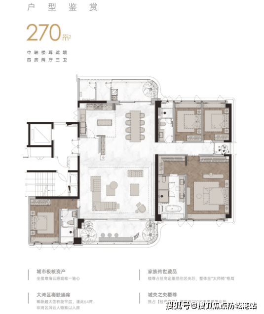 建面约264㎡五居大平层,作为项目顶奢户型,配备地上地下双落客大堂,10.8米挑高星级酒店式中空大堂,出入皆享礼遇;专属私密电梯配置,独户阳光电梯尊享,从容归家。户型采用豪华套间设计,主卧配备步入式衣帽间、独立卫浴与观景露台,功能分区明确,兼具居住舒适度与社交仪式感,打造终极改善人居。