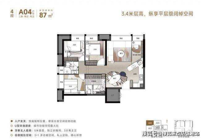 87㎡户型功能丰富,满足家庭多样化需求。入户预留鞋柜位,增加全屋收纳空间,方便日常生活。U 型环绕厨房操作空间阔绰,洗切煮动线流畅,为烹饪提供便利,无论是家庭聚餐还是日常烹饪都能轻松应对。5 米顶奢主卧配备独立衣帽间,满足主人对衣物收纳和私密空间的需求,彰显生活品质。3 + 1 多功能空间可根据个人喜好进行私人定制,可改造成书房、儿童游乐区或健身房等,随心所想,充分满足家庭不同阶段的生活需求。