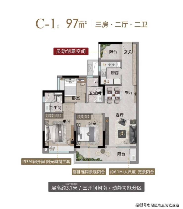 建面约97㎡三房两厅两卫:刚需首选户型,得房率约78%,户型方正,南北通透,客厅连接宽景阳台,采光通风极佳;主卧带独立卫浴,私密性强,适合三口之家居住,空间布局紧凑,无浪费面积。