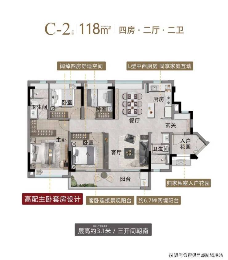 建面约118㎡三房两厅两卫:刚改户型,得房率约79%,户型方正开阔,客厅与餐厅相连,提升空间感;阳台尺寸宽敞,可兼顾休闲与储物,主卧带衣帽间与独立卫浴,适配四口之家或有改善需求的刚需家庭。
