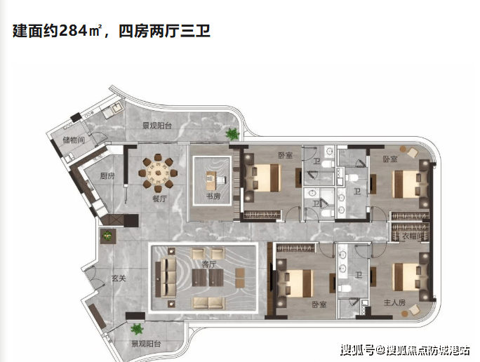 南向三开间、270°观景阳台、纯南主卧飘窗,尽享阳光与江景。
