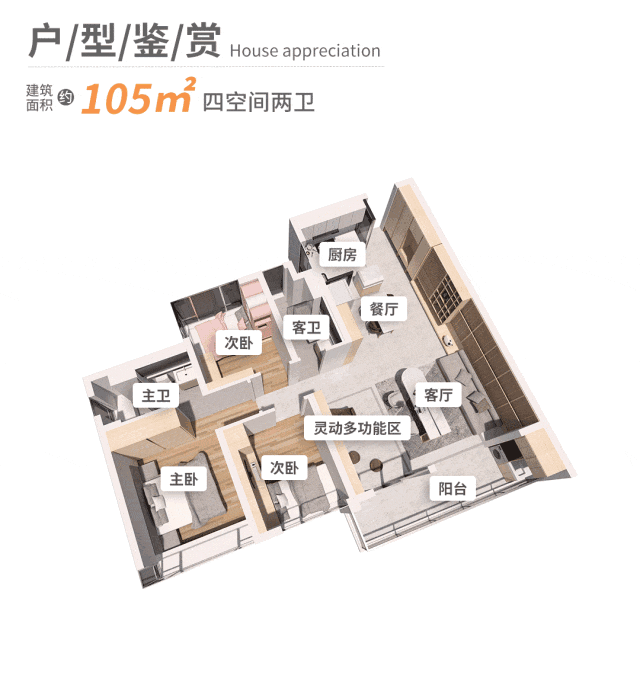 105㎡的四房两卫,则更偏向二胎或多代同堂家庭。四开间朝南,配上约6米南向大阳台,客厅、餐厅、厨房、可变空间一体化,形成LDKB格局,空间感媲美120㎡级别的大户型。家庭聚餐或周末娱乐,十几个人各有活动空间也不挤。两个次卧设计均衡,一个纯南向,一个带270°大飘窗,视野和光线都照顾周全,整体居住舒适度很高。