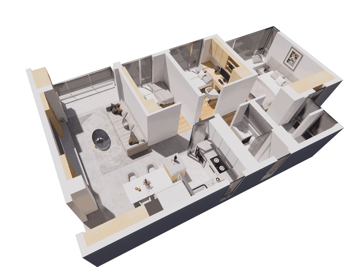 再看82㎡的三房两卫,在75㎡基础上进一步放大每个功能区的尺度。全南向布局让阳光洒满房间,多功能房的设计特别灵活,可以根据家庭变化随时切换模式。比如做成二胎宝宝的独立卧室,两个次卧面积和朝向相当均衡,避免争抢;或者改成书房、工作室,打造安静的私人空间;甚至拆掉墙体和客厅连通,形成大开间客厅,聚会时更显大气。居住体验直接升级,家庭成长不同阶段都能适应。