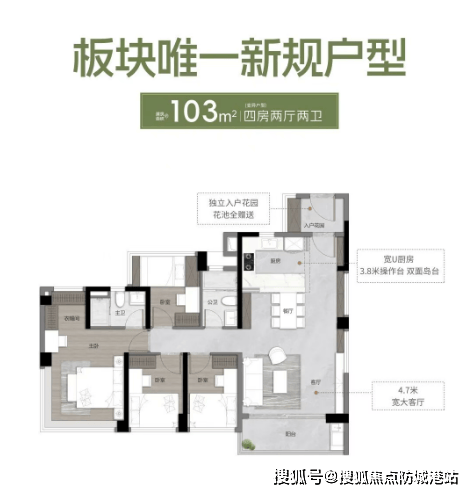 4. 建面约103㎡户型:四房两厅两卫,适合四口之家、三代同堂的刚改家庭。这款户型配备独立入户花园,既能保障居家隐私,又能作为收纳空间、玄关花园,提升居住质感;带约7米通铺阳台,采光通风极佳,部分户型可实现270°瞰景,视野开阔;270°全景采光大主卧,空间宽敞,私密性强,四个卧室布局合理,动静分区清晰,无鸡肋空间,实用性拉满,能轻松满足多人口家庭的居住需求。