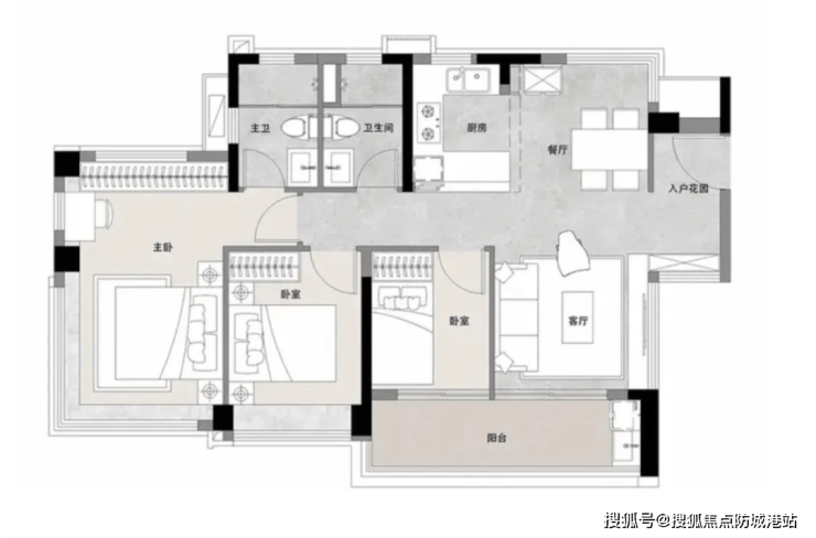 三个卧室都在南向,整个空间的通风和采光不错,整体居住感不错,带有入户花园、双开间大阳台、LDK公区、主卧卫浴也做了干湿分离。