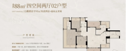 第二种主力户型:建面约88㎡四房两厅两卫,该户型为刚改首选,分布于4条梯腿,共100套,使用率约114%-120%,装修标准为舒适刚需装修,在基础装修的基础上,增加了更多人性化设计和品质细节。户型整体布局合理,南北通透,空间开阔,四房设计能够满足多人口家庭的居住需求,无论是三代同堂还是二胎家庭,都能轻松容纳,同等面积多一房,性价比突出,是白鹅潭惟此新规约88㎡四房户型。客厅连接宽景阳台,阳台视野开阔,可欣赏社区园林景观,部分中高层户型还能眺望珠江,景观优势突出;餐厅与客厅相连,形成开阔的公共活动空间,方便家人聚会、朋友宴请。四个卧室均带飘窗设计,空间利用率高,采光通风效果极佳,主卧为套间设计,配备独立卫生间和衣帽间,提升了居住的私密性和舒适度,适合主人居住;三个次卧空间宽敞,可作为儿童房、书房、老人房或客房,满足不同家庭的需求。厨房采用L型设计,动线流畅,操作便捷,同时预留了冰箱、洗衣机等家电摆放位置,提升了实用性;两个卫生间均为干湿分离设计,公共卫生间靠近次卧和客厅,使用便捷,主卧卫生间私密性强,提升居住舒适度。该户型空间开阔、功能齐全,兼顾实用性与舒适度,是刚改人群的理想选择。