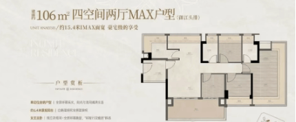 第三种户型:建面约106㎡四房两厅两卫,该户型为刚改向改善过渡户型,分布于2条梯腿,共40套,使用率约112%,装修标准为舒适装修,品质更高,细节更完善。户型整体布局大气,南北通透,空间开阔,四房两厅两卫的设计,能够满足多人口家庭的居住需求,同时兼顾私密性和舒适度。客厅连接超大宽景阳台,阳台视野开阔,部分高楼层户型可眺望珠江,在家就能观赏白鹅潭烟花汇演,景观一绝,同时兼具晾晒、休闲、观景等多种功能。四个卧室均为南向或南北通透设计,采光通风效果极佳,主卧套间设计,配备独立卫生间、超大衣帽间和飘窗,居住舒适度极高,能够为主人提供奢华、私密的休息环境;三个次卧空间宽敞明亮,可作为儿童房、老人房、书房或客房,其中一个次卧可改造为多功能室,满足家庭的多样化需求。厨房采用开放式与封闭式结合的设计,可根据业主需求灵活切换,操作空间充足,配备品牌厨具,提升烹饪体验;两个卫生间均为干湿分离设计,配备品牌卫浴洁具,公共卫生间采用双台盆设计,方便家人同时使用,提升使用效率。该户型空间大气、功能齐全,品质出众,景观优势突出,适合有改善需求的刚改人群或多人口家庭居住。