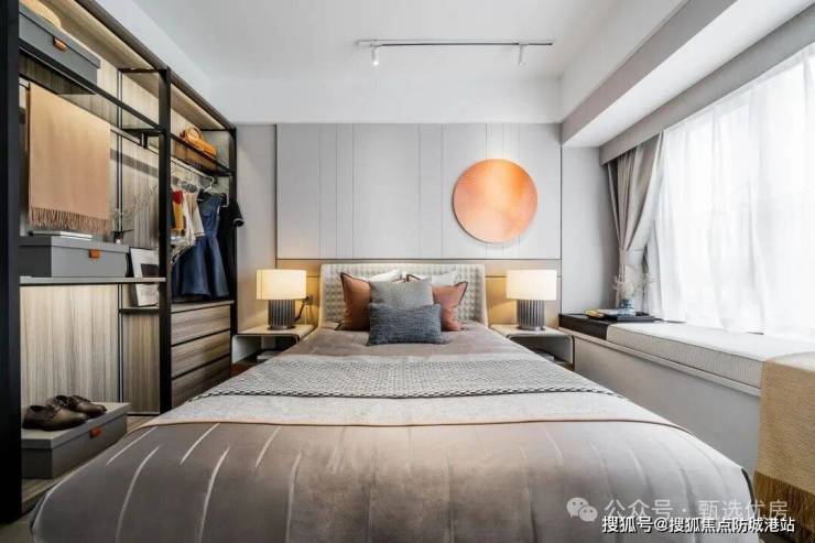 主卧的设计同样极为出色,主卧带 270° 的全景飘窗,这个飘窗是全赠送的面积,不计入产权,为业主又省下了一笔不小的成本。这个 270° 的飘窗,拥有两个方向的采光面,采光极为充足,而且视野极为开阔,中高楼层的业主,还可以在这里欣赏到德胜河的江景,将德胜河的美景框入家中,每天醒来,就能看到窗外的江景与园林,心情都会变得格外舒畅。业主还可以根据自己的需求,将这个飘窗改造成飘窗柜,用来收纳衣物、杂物,也可以改造成一个小型的休闲区,在这里喝茶、观景,享受属于自己的私密时光。