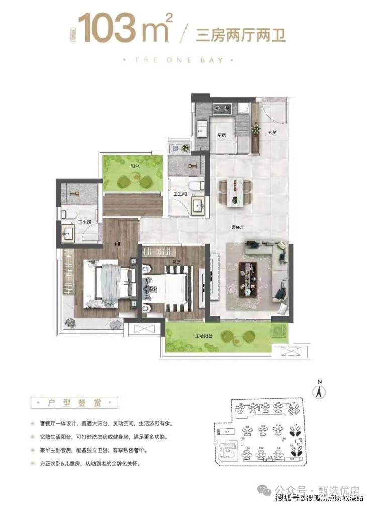 作为二期的入门级新规户型,建面约 99㎡的三房两厅两卫,完美适配了刚需家庭的居住需求,虽然建筑面积只有 99㎡,但是依托超新规的政策红利,这个户型的实得面积堪比市面上旧规的 115㎡户型,空间极为宽敞,完全可以满足三口之家的全周期居住需求。