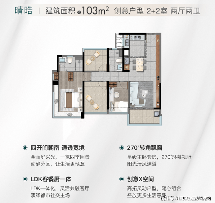 * **【艺术与功能】**:建筑塔楼为轻奢度假酒店风格,外立面采用大面积玻璃加真石漆墙面。户型设计上,有建面76㎡三房两卫、86㎡2+1房两卫、89㎡三房两卫等多种户型可供选择,所有户型南北通透,采光通风佳,部分中高楼层可一线看江,还有270°转角飘窗主卧、南向宽景阳台等设计。