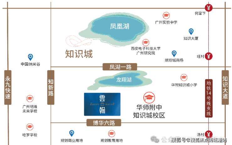 广开云翰距离地铁14号线汤村站约2公里,虽然步行稍远,但通过创新大道和永九快速(建设中)两大城市快速路可以方便地接驳科学城及天河区。此外,项目毗邻花莞高速知识城出口,并连通广河高速、华南快速干线以及从埔高速(建设中),为居民提供了便捷的出行条件,无论是自驾还是公共交通都能轻松畅行湾区发展核心区。